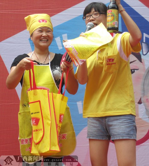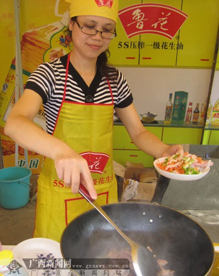 夺得周冠军的许女士。 广西新闻网实习生 黄丽媛摄 广西新闻网南宁5月13日讯(实习生 黄丽媛)12日上午,阳光明媚,如同天气一样持续升温的“鲁花·厨艺大赛”再度跟随服务大篷车走进南宁市社区。这次大篷车开进了北湖路西二里的振宁公寓,社区的美厨娘们纷纷一展厨艺。最终一号选手许女士夺得本场厨艺大赛的周冠军。 上午10点,参加厨艺大赛的选手们各就各位,拉开一场火爆的厨艺大PK。比赛原料为:猪肉、青椒、洋葱、胡萝卜、姜。这次厨艺大赛的参赛选手是清一色的家庭主妇,正可谓“上得厅堂,下得厨房”,她们纷纷表示自己在家都是“掌厨的”,准备使出十八般武艺,来争夺周冠军。