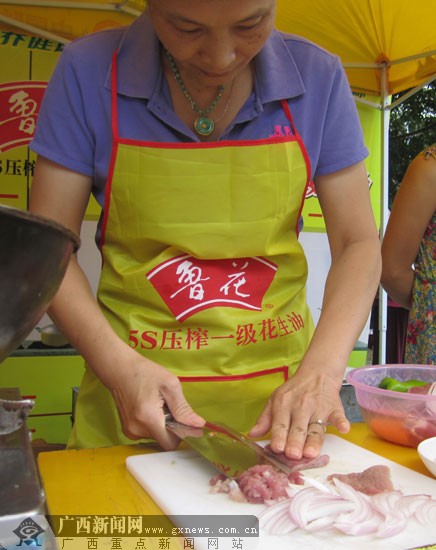 热火朝天的厨艺大赛现场。 广西新闻网实习生 黄丽媛摄 选手小心翼翼地“片”猪肉。 广西新闻网实习生 黄丽媛摄 短短几分钟,一碟碟色香味俱全的美食就上桌了。白的洋葱、红的萝卜、绿的青椒,搭配起来煞是好看。大众评委们争相品尝现做的美味佳肴,一边吃一边点头称好。 通过10位大众评委的认真评判,最终一号选手许女士以6票的优异成绩脱颖而出,夺得本场厨艺大赛的周冠军。这是她第一次参加这样的比赛,抱着试试看的心态就来了,没想到意外抱得大奖归。但许女士却认为今天自己并没有发挥好,“太紧张了,切菜的时候手抖了。”那么,做印刷工人的许女士是怎么练就高超厨艺的呢?“懂得腌菜很重要,更要掌握好火候”,这就是她把肉炒的鲜嫩可口的秘诀了。