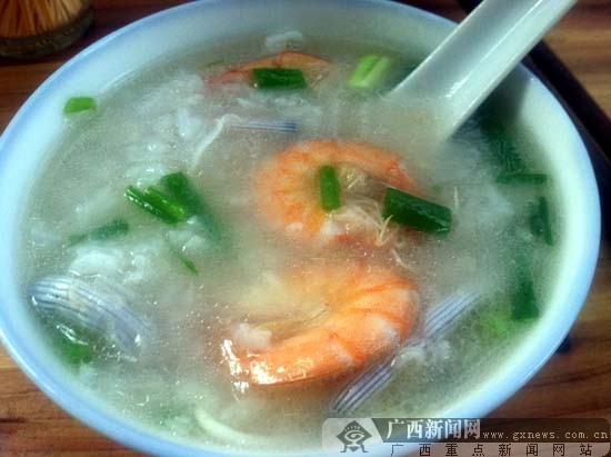 广西新闻网南宁10月8日讯(记者 秦丽君)东兴是沿海开放城市,自然就少不了有海鲜了,那里的海鲜粥,海鲜炒粉,海鲜炒面,鱼露,海螺尽显边界城市的异国风情。 粥是我国自古以来的传统食物了,在很久以前,古人就以喝粥来养生延寿,而且喝粥有助于消化吸收,对胃也是有帮助的。在天气燥热的地区,喝粥是他们日常生活的必须品。 鱼露海鲜粥。广西新闻网记者 秦丽君 摄