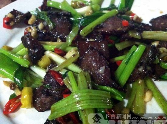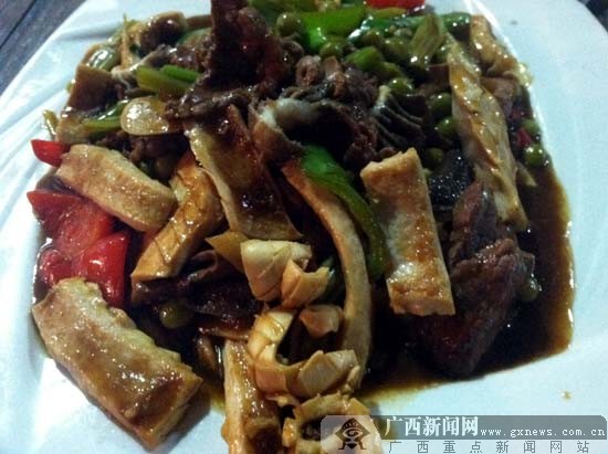 香辣辣牛肉。广西新闻网记者 秦丽君 摄 玉林牛杂作为龙腾私房菜馆一直以来的热卖品,在工艺上传承了玉林牛料的技术,使得牛杂香脆,肉也好嚼,不添加任何色素与香料也成了大众健康饮食的首选。爱吃鱼的吃货应该都知道,如果鱼处理不好吃起来会比较腥,而一桌菜里,当然也少不了鱼。罗非鱼肉嫩,少刺,口感鲜美,用滋补甜酒进行小火焖制,让甜酒的味慢慢渗入鱼肉,吃起来开胃解腻。辣牛肉则选用牛身上最好的肉,用青椒与红椒配上大蒜跟少许的葱花炒,牛肉伴着丝丝辣椒的芬芳吃起来很是鲜嫩。 菜馆的老板是地道的玉林人,浓浓的玉林口音让人印象深刻。当聊起开店的初衷时,老板告诉我们:“身为一个玉林人,把玉林的特色饮食文化传播出去,就是一种责任,感到十分的荣耀!”