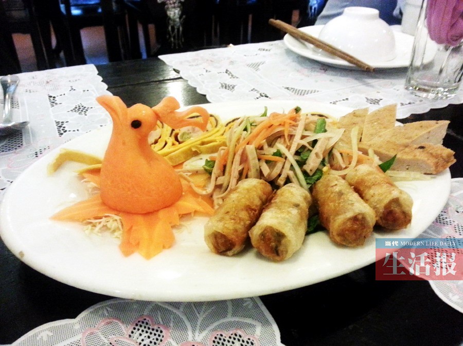 越南春卷,令人垂涎。 吃喝住行 乐趣无处不在 对于爱吃、会吃的广西人来说,旅游时一定会去搜罗当地的美食。 到了岘港,海鲜、越南鸡肉粉和春卷一定要品尝。无论是酒店里的鸡肉粉,还是会安古镇街边小摊的凉拌粉,都酸甜可口。值得一提的是当地的红薯。粉粉的,甜甜的,非常好吃。考察团中几位从来不吃红薯的广西姑娘,到了岘港之后,每天早上必吃的食物之一就是红薯。当地的酸奶也不错,跟我们在国内吃的很不一样。记者最中意的品牌是BAVI,无论是原味的,还是百香果味的,都很好吃。口感很纯粹,很柔嫩,酸得恰到好处。 当地吃的东西很干净也很讲究。记者自小肠胃敏感,此行却无任何不适。 旅行中,我们住得最久的是当地的皇冠假日酒店。酒店老板是中国人,酒店的档次和服务堪称一流。当地的很多酒店都沿海而建,精致、舒适而又大气,是东西方经典建筑风格的结合品。 旅行结束之际,想给亲友带些当地特产,咖啡和腰果是必买的。一罐500克的腰果,在农贸市场卖14万越盾(相当于人民币40元),如果你买得多,还能议价,最低能砍到25元。连购物都让人觉得富含乐趣。