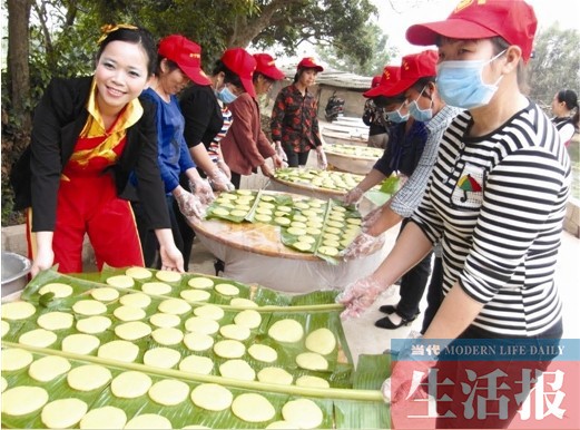 特色小吃迎宾朋 邕宁区那元社区举办传统小吃品尝会 广西新闻网-当代生活报记者 王建伟 文/图 4月1日上午,南宁市邕宁区那元社区组辖区居民,在那美坡举办了一次与众不同的“小吃品尝会”。大家通过手工制作生榨米粉、水磨糍粑、五色糯米饭、甜藕等特色传统食品,既招待了亲朋好友,也促进了邻里关系。 当日上午10时许,记者赶往那美坡看到,一群身着民族服装的年轻姑娘在进村道路上摆上竹竿,所有到场的嘉宾先跳上一段欢快的“竹竿舞”才能进村。在村口的一片空地上,几口大锅热气腾腾,只见村民们正在制作各种传统小吃,准备招待客人。虽然那美坡没有一座像样的舞台,但当地村民还是在一块白色塑料布铺就的“舞台”上,表演了一个又一个精彩的节目,围观群众也很捧场,现场气氛十分热烈。 等节目表演完,差不多到了吃午饭的时间。这时候,生榨米粉、水磨糍粑、五色糯米饭等传统特色小吃也都做好了。活动现场没有那么多桌椅,但面对美食,食客们并不拘泥于这些,蹲在大树下也吃得酣畅淋漓。